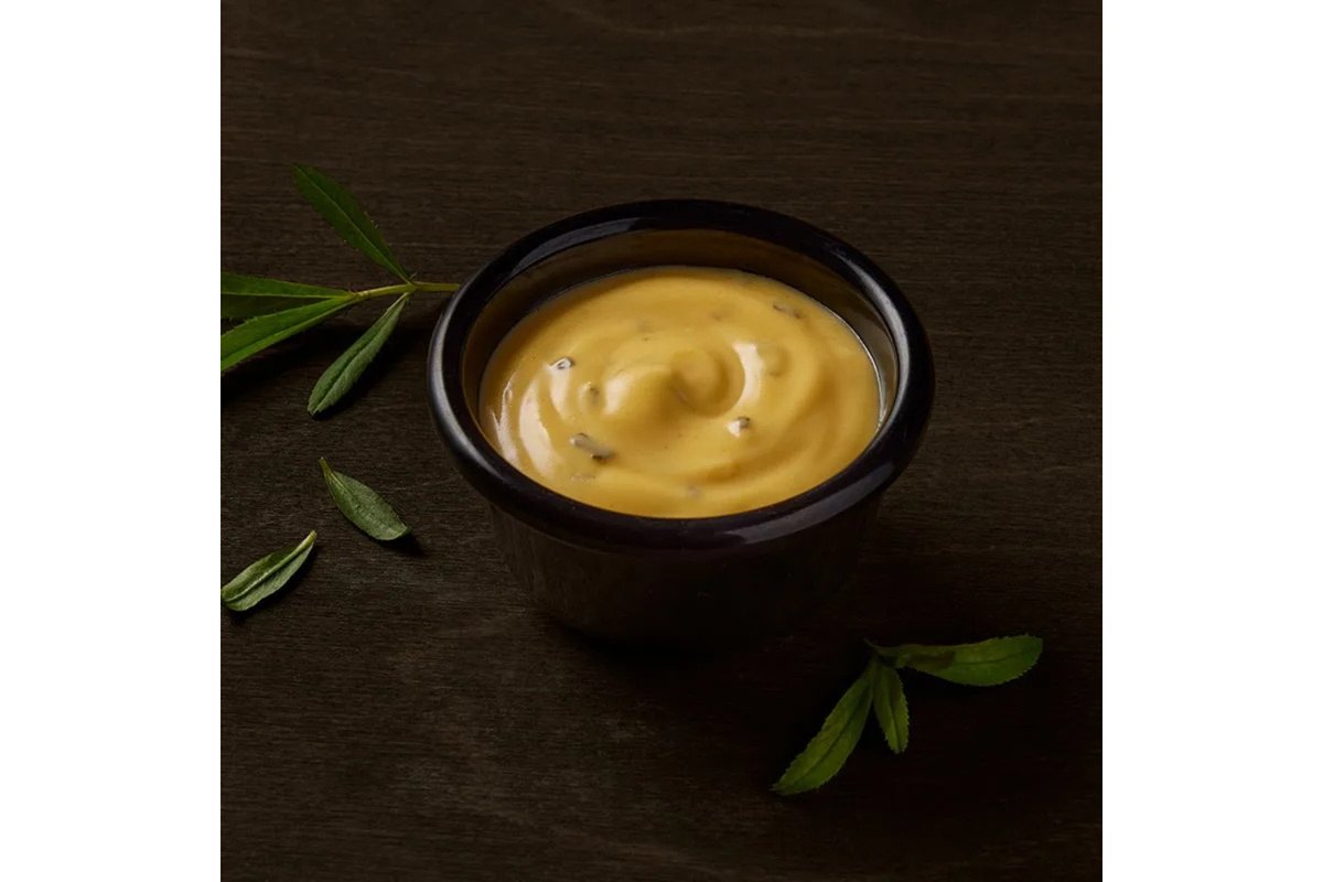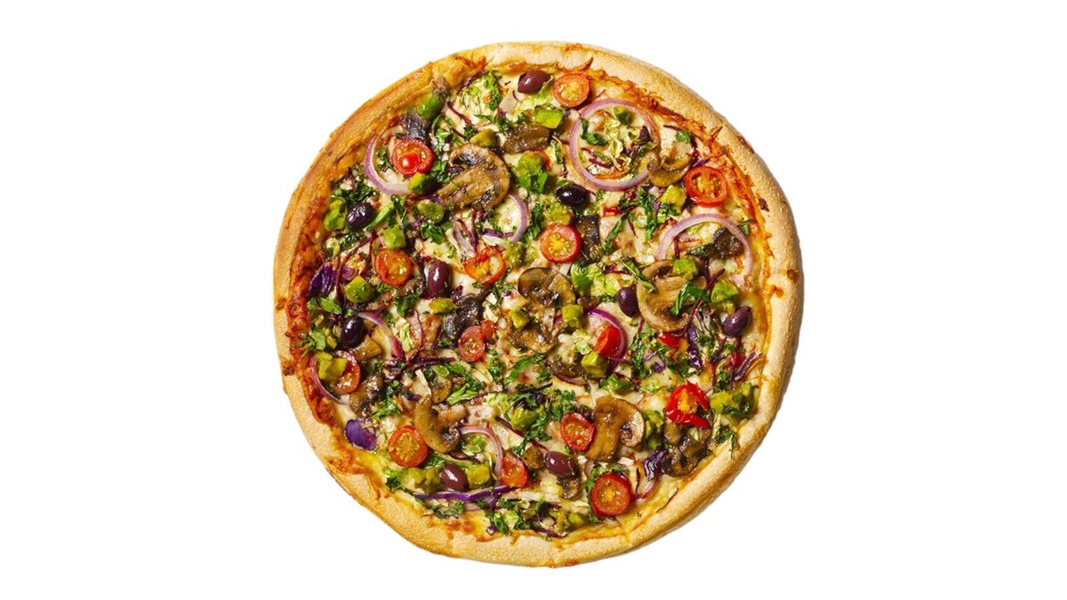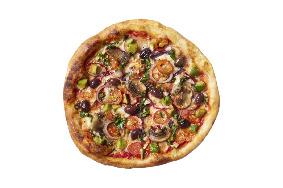 Avokado, rødløk, champignon, oliven, cherrytomat og grønnkål. Osten er byttet ut med en smaksrik vegansk aioli. Toppes med nykvernet pepper og limezest. Oliven kan inneholde olivensteiner