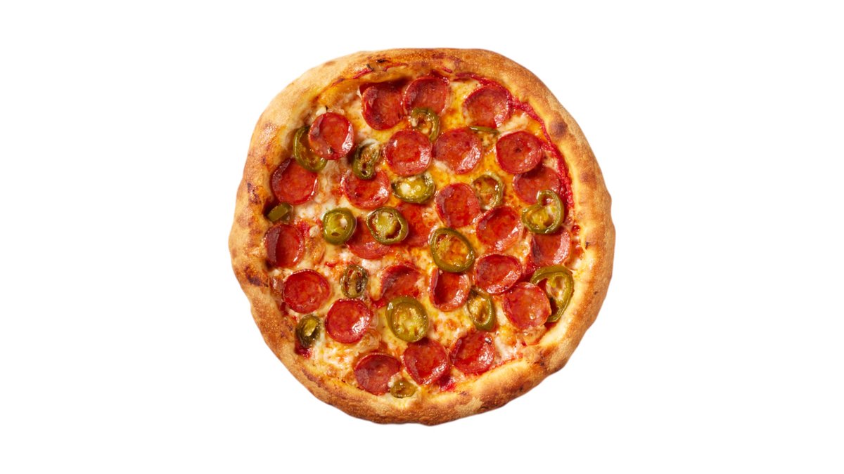 Ekstra mye topping. Pepperbiff 'nduja, rødløk, jalapeño, Peppes osteblanding og cheddar. Toppes med honning.