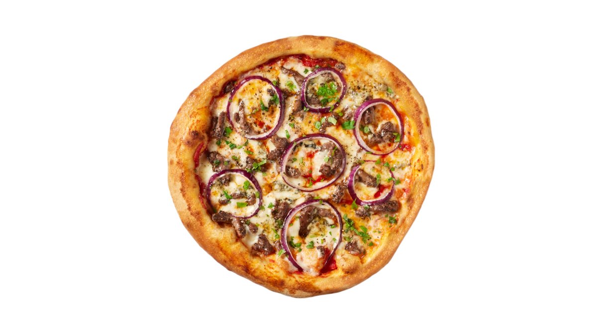 Tomatsaus, mozzarella, pepperbiff, rødløk og blåmuggost. Toppes med nykvernet pepper, honning og hakket bladpersille.