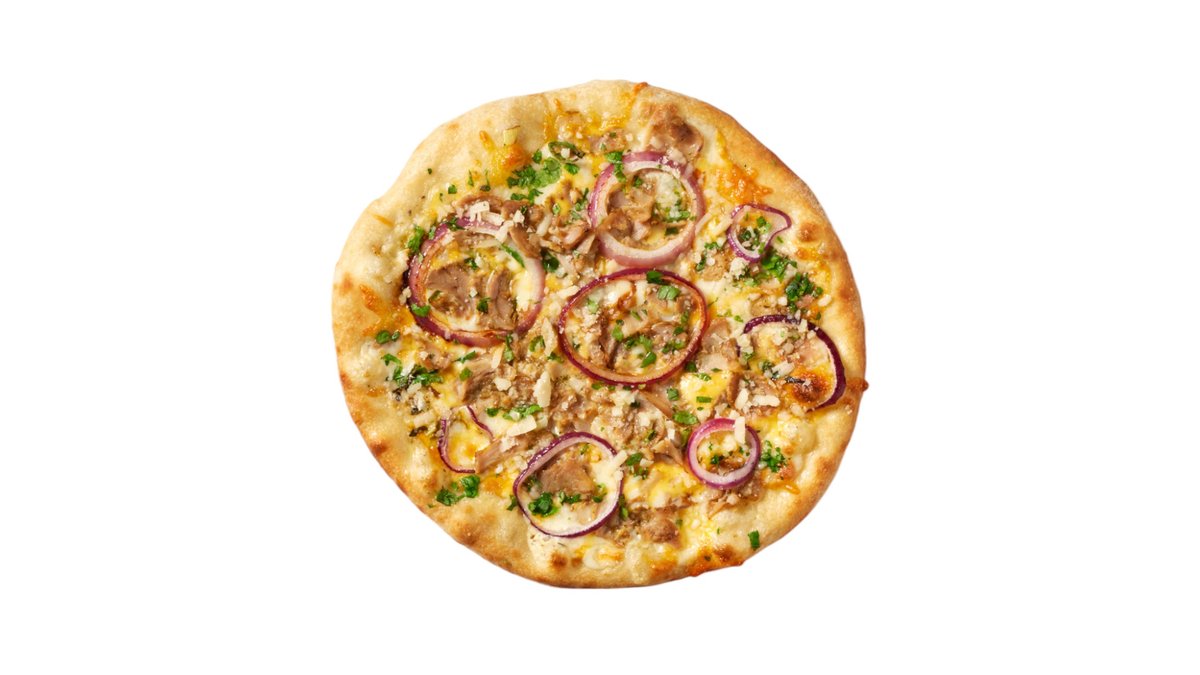 Hvit saus, mozzarella, cheddar, kylling lårkjøtt, purre og rødløk. Toppes med grana padano og hakket bladpersille.