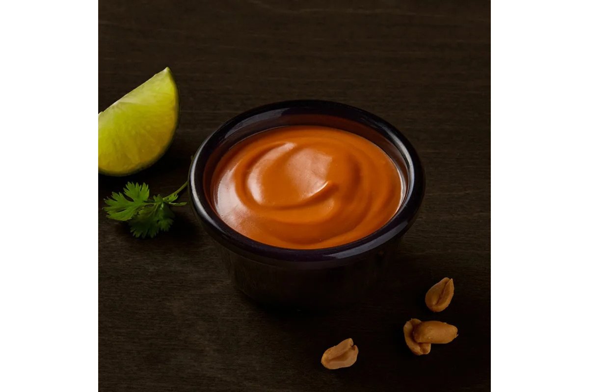 Satay-marinert kylling, paprika, rødløk, ananas, sataysaus og peanøtter. Toppes med fersk koriander og limezest. Melk hvete, soya, peanøtter