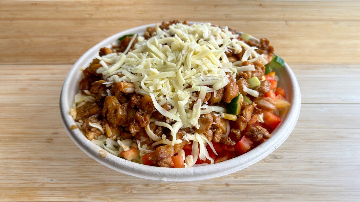 Salat med ananas, pasta, vårløk, rødløk, krutonger, oliven paprika, mais, agurk, sjampinjong, fetaost og revet ost. Velg ønsket type kjøtt og dressing.