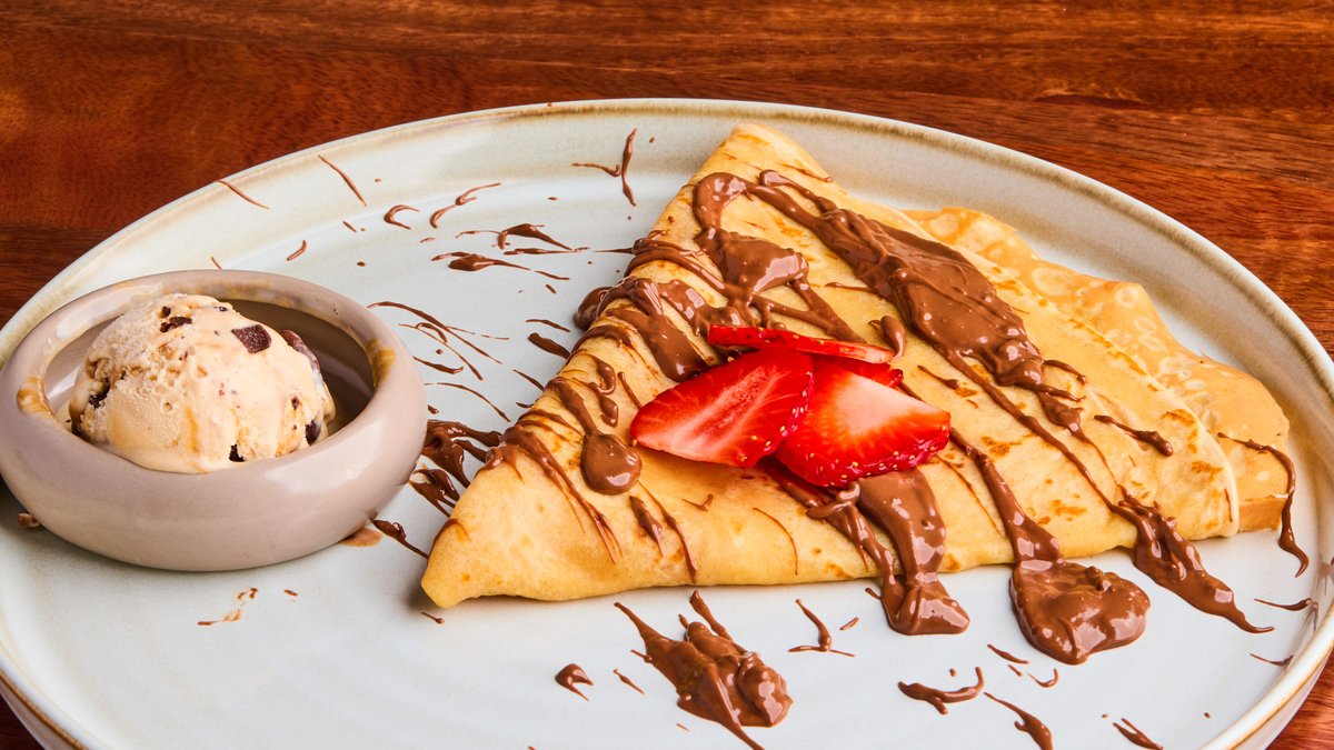 Crepe med banan, jordbær og smeltet belgisk melkesjokolade.