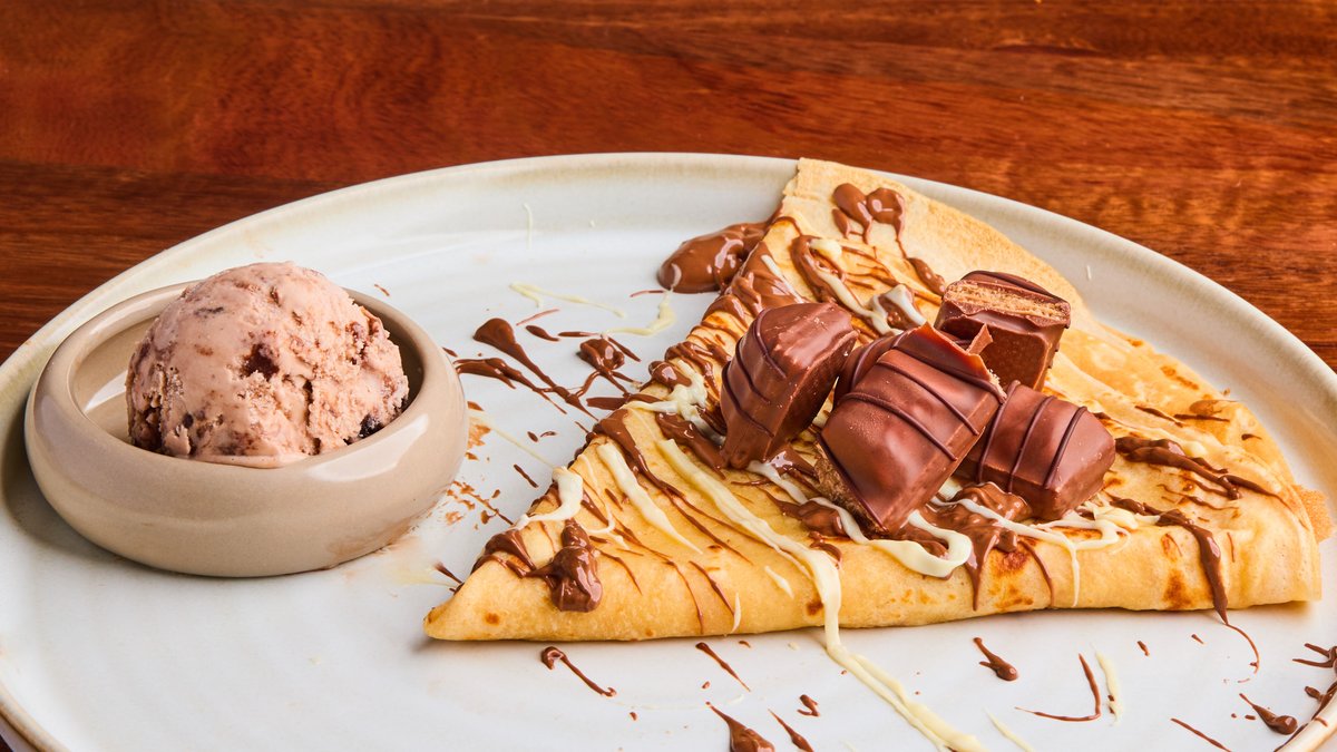 Crepe med kinder bueno sjokolade, belgisk melkesjokolade og belgisk hvit sjokolade