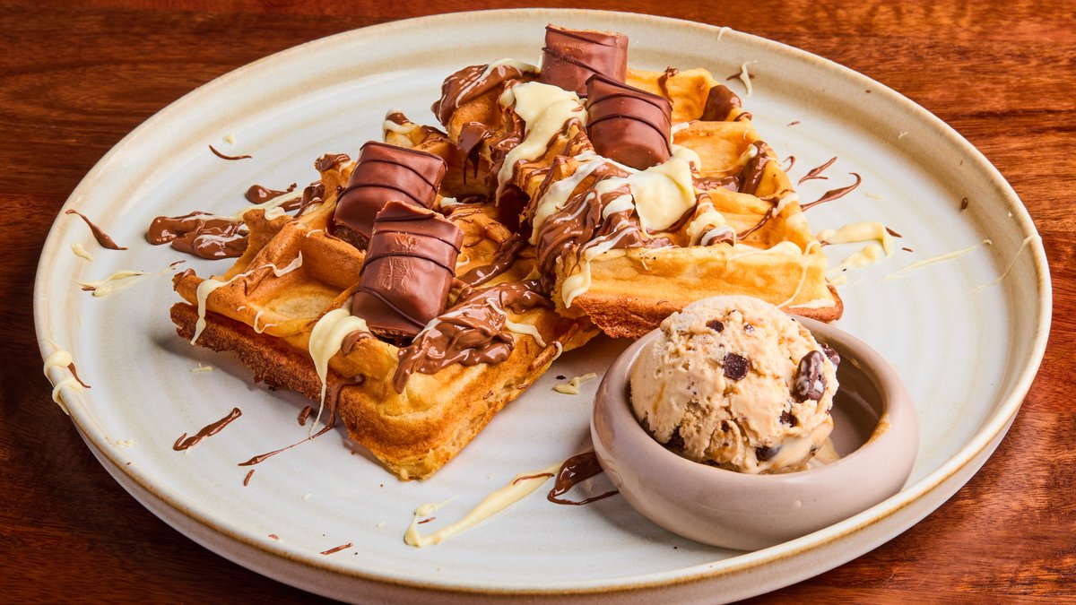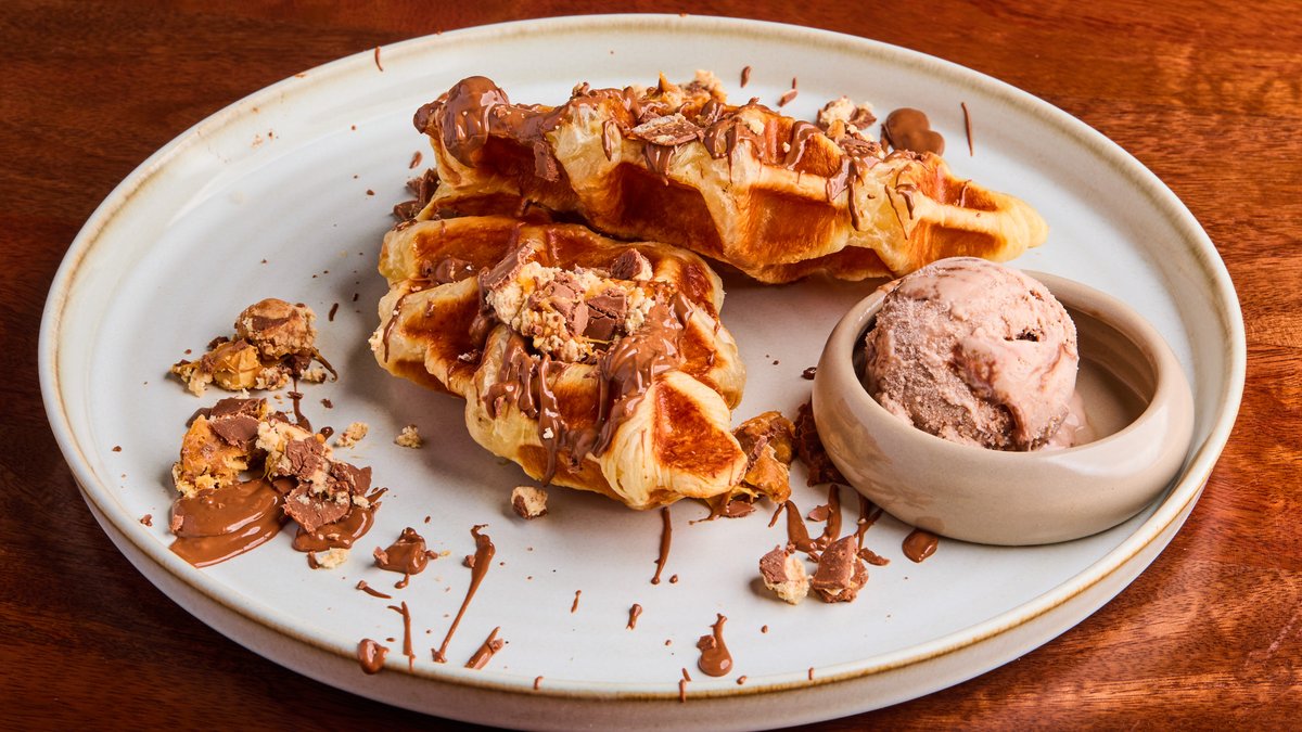 Croffle toppet med snickers sjokolade og smeltet belgisk melkesjokolade. Serveres med vanilje iskrem Allergener: Gluten, melk, egg, soya, peanøtter
