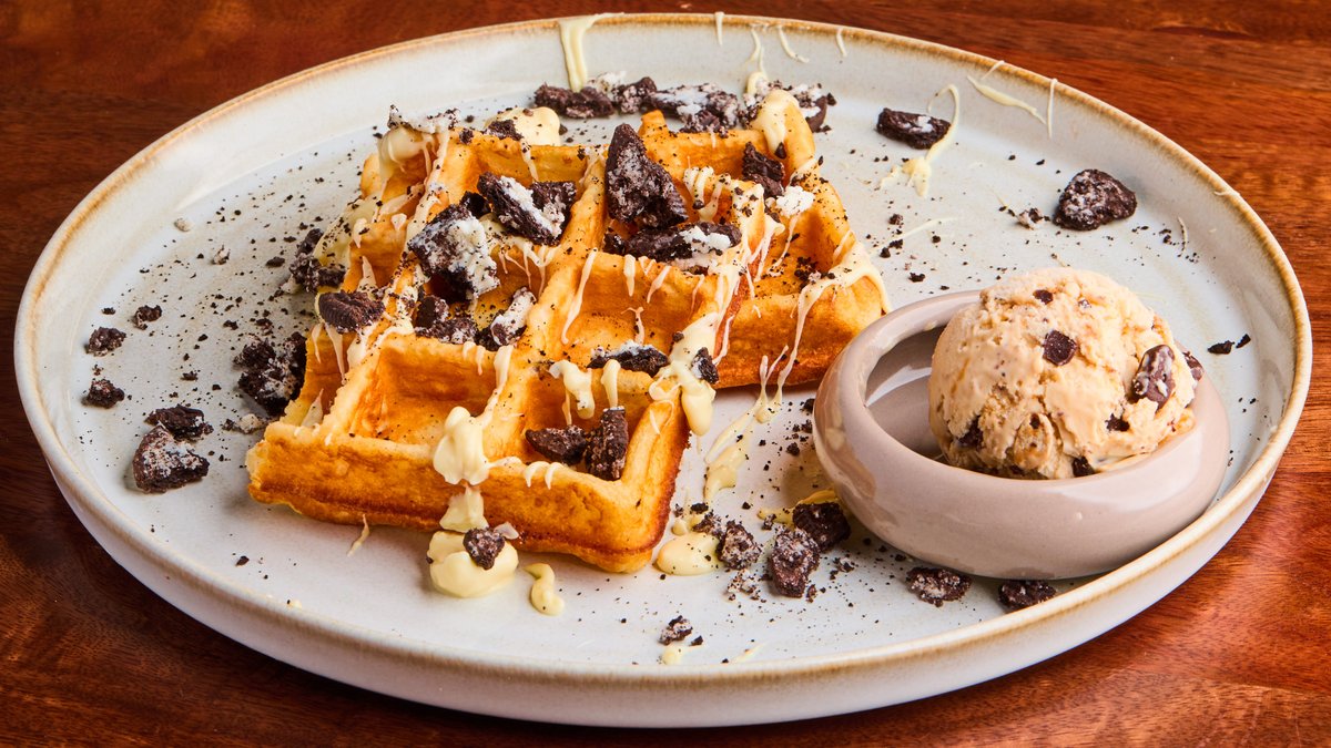 Vaffel toppet med knuste oreokjeks og smeltet hvit sjokolade.