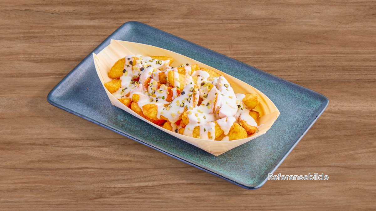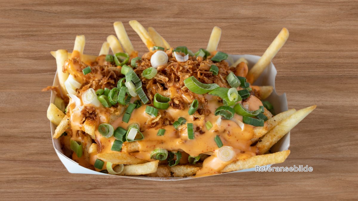 Kraftige pommes frites med husets dressing, vårløk, ostemiks og parmesan.