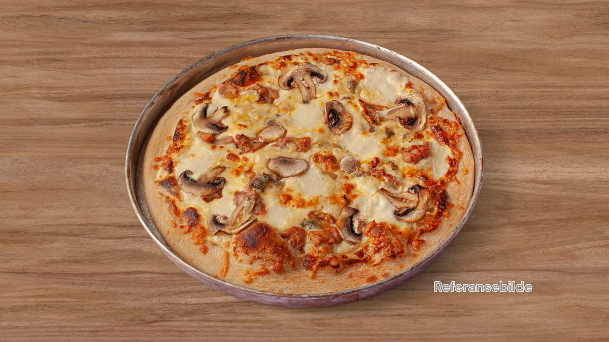En kremet pizza med vårkrem, fior di latte-mozzarella, soppmiks, gorgonzola picante og oregano.