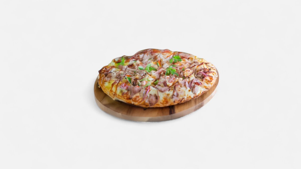 En kraftig pizza med san marzano-tomatsaus, fior di latte-mozzarella, biff, rødløk og oregano.