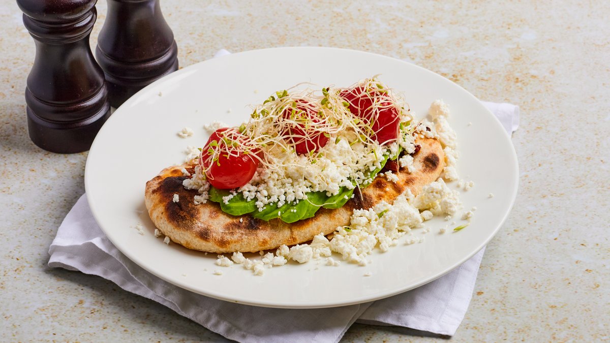 Hjemmelaget brød, soltørkede cherrytomater, peppardew, skjørost og spirer. Det kan ikke legges til ingredienser til retten.