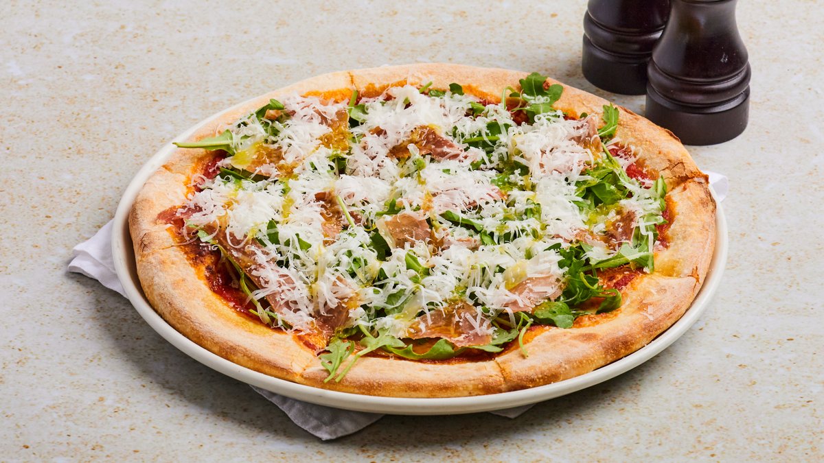 Mozzarella, parmaskinke, olivenolje og ruccola Det kan ikke legges til ingredienser til retten.
