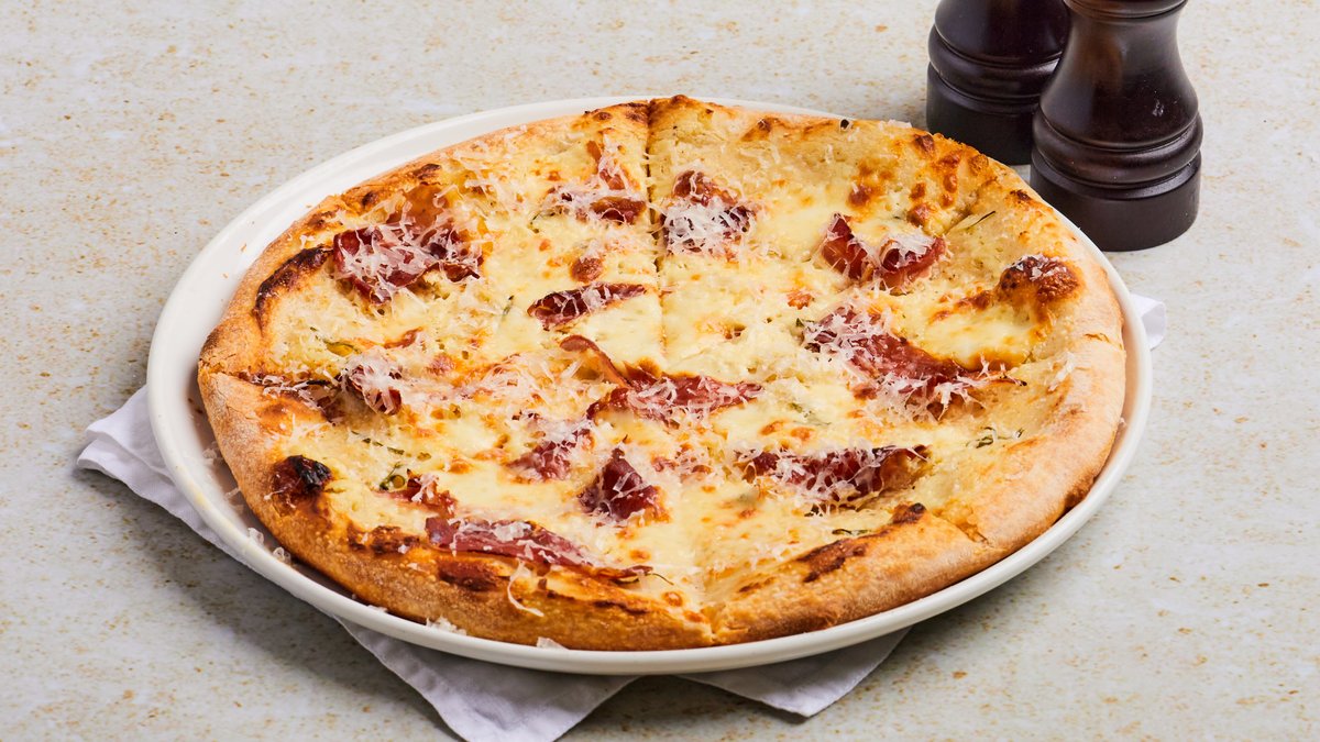 Creme fraiche saus, mozzarella, parmaskinke og rosmarin. Det kan ikke legges til ingredienser til retten.