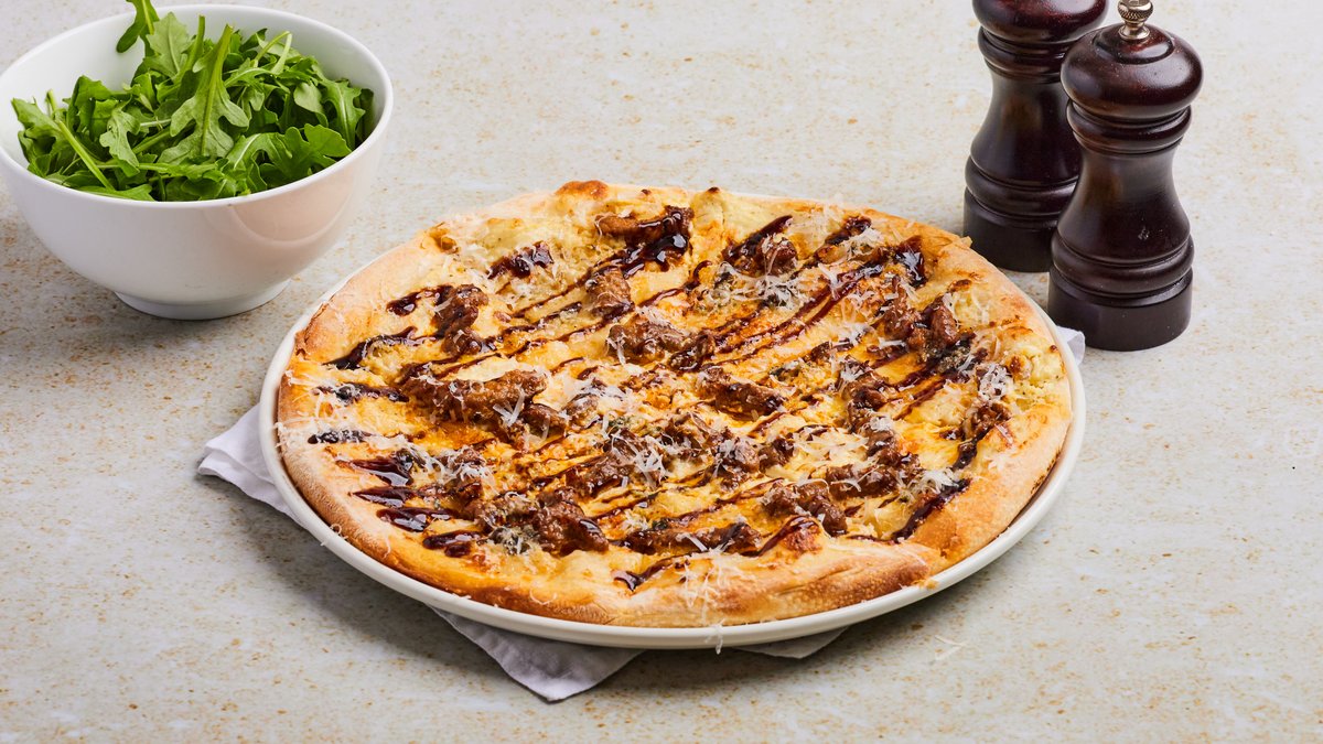 Creme fraiche saus, gorgonzola, marinert biff, ruccola og balsamico. Det kan ikke legges til ingredienser til retten.