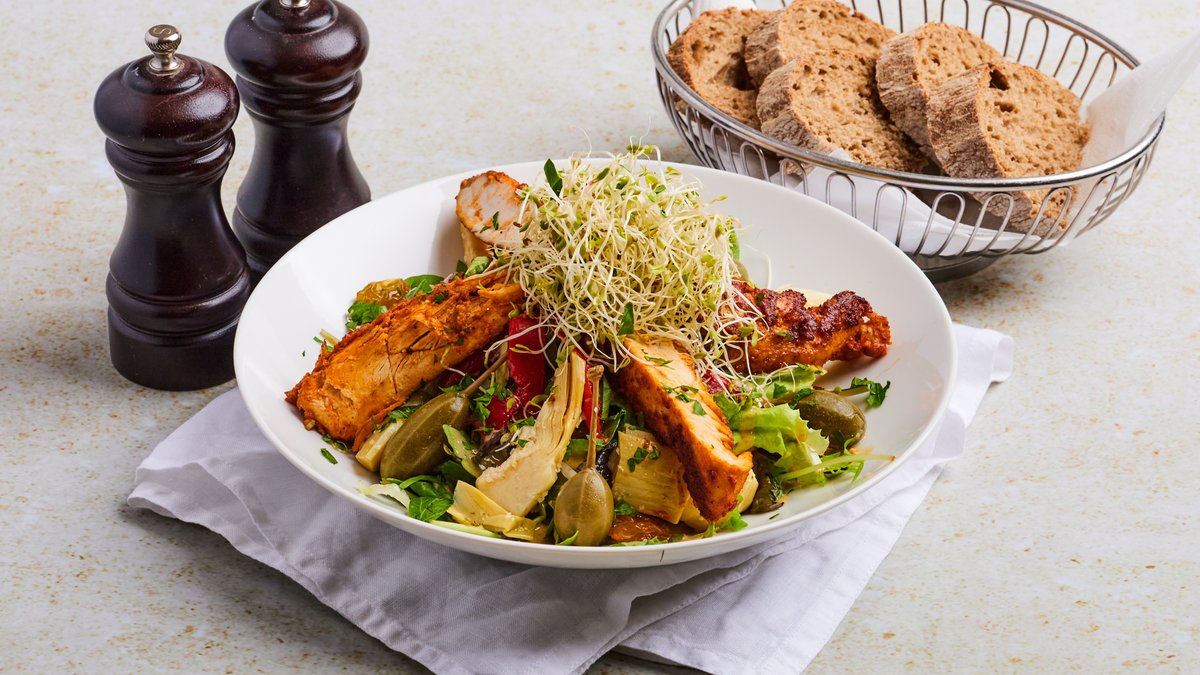 Saftig kyllingfilet, artisjokk, rosin, grillet paprika og kapers. Peanøtt- og karridressing. Serveres med grovt landbrød og smør. Det kan ikke legges til ingredienser til retten.