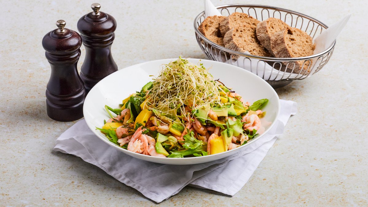 Med mango, avokado og ingefærdressing. Serveres med grovt landbrød og smør. Det kan ikke legges til ingredienser til retten.