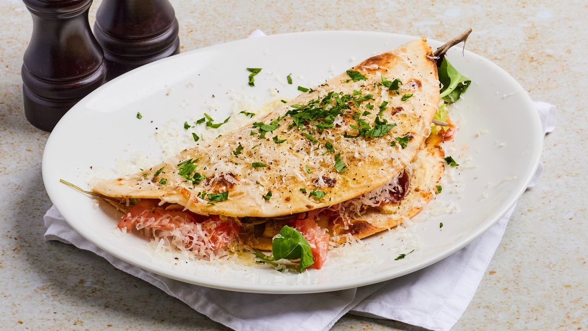 Crème fraîche saus, mozzarella, parmaskinke, salat, tomat og parmesan. Det kan ikke legges til ingredienser til retten.