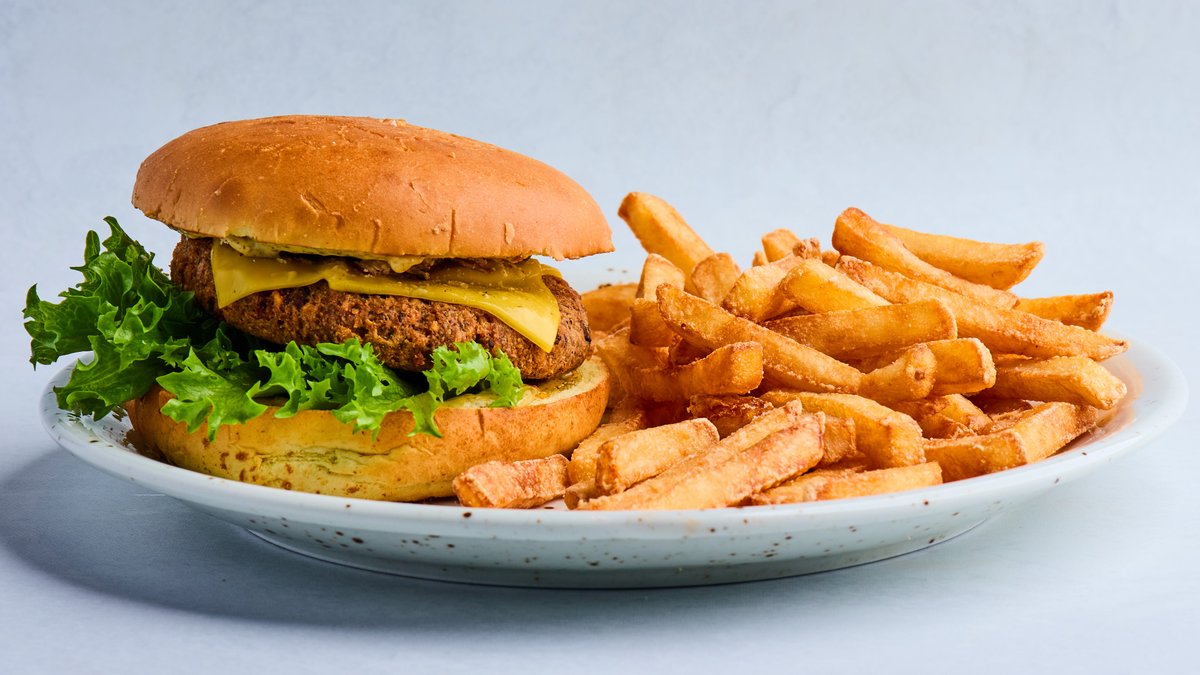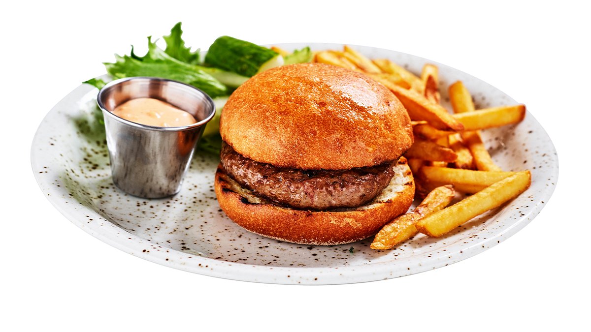 100g Hamburger i hamburger brød serveres med salat med agurk, O'Learys hamburgerdressing og sprø pommes frites ved siden av.