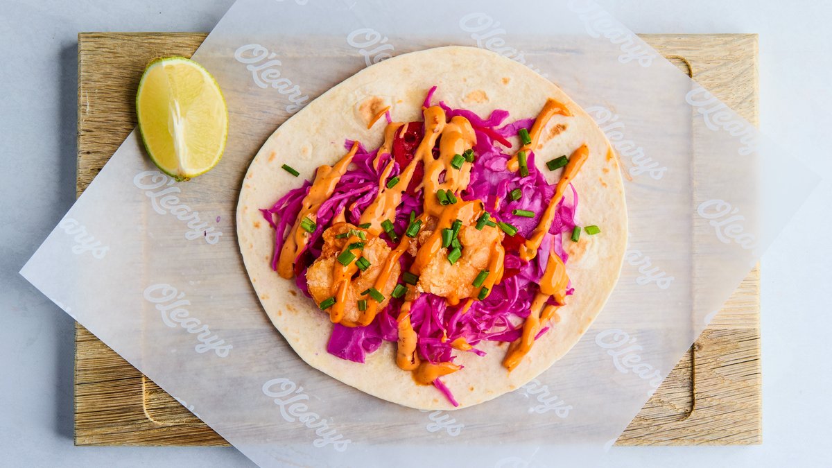 Tortillabrød med sprøstekte Vannamei-reker, jalapeño-syltet kålsalat, chilimajones og lime. Toppet med gressløk.