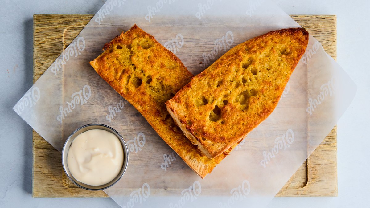 Surdeigsbaguette gratinert med ost og hvitløkssmør. Serveres med kremet aioli.