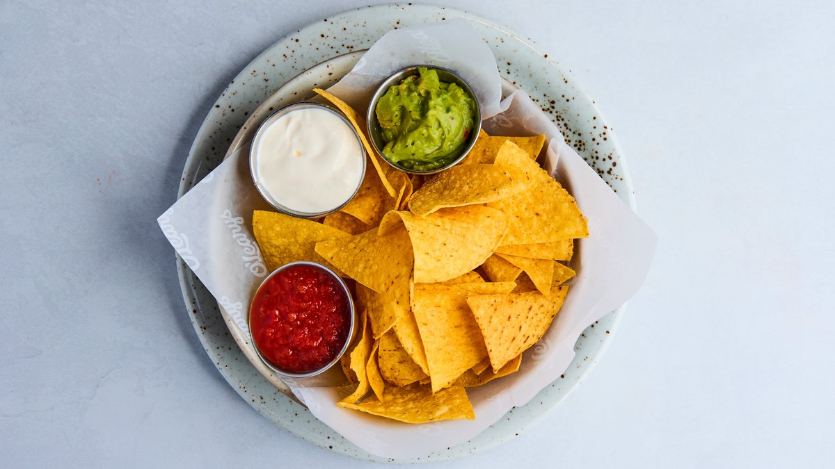 Sprø nachos med rømme, guacamole og salsa ved siden av.