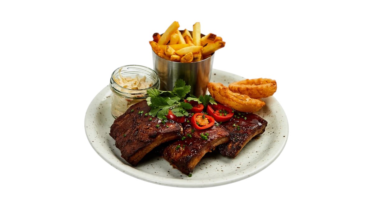 Saftige baby back ribs glasert med O'Learys signature BBQ-saus, toppet med syltet jalapeño, gressløk og litt koriander. Serveres med pommes frites, friterte løkringer og coleslaw.