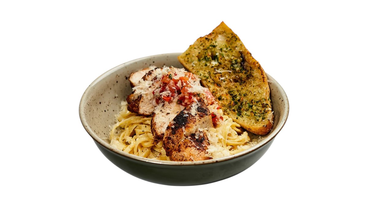 Kremet pasta med fløte, parmesanost, krydret kyllingfilet og pico de gallo. Serveres med gratinert hvitløksbrød.