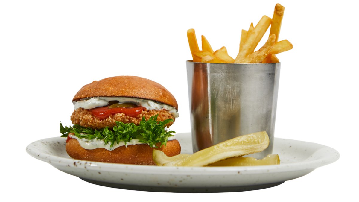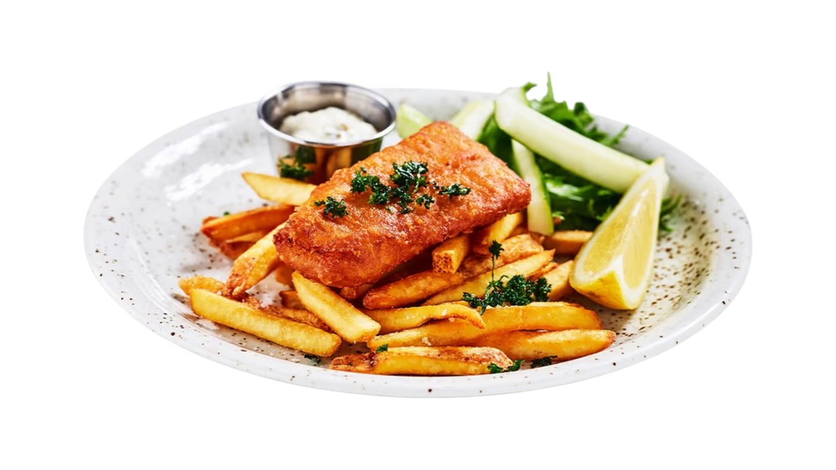 Fritert torskefilet toppet med fritert persille. Serveres med tartarsaus, grillet sitron, jalapeño pickled slaw og pommes frites.