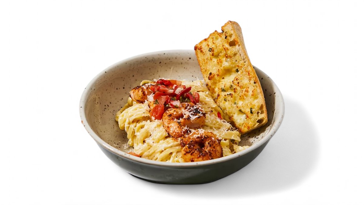 Kremet pasta med fløte, parmesanost, vannamei-reker og pico de gallo. Serveres med gratinert hvitløksbrød.