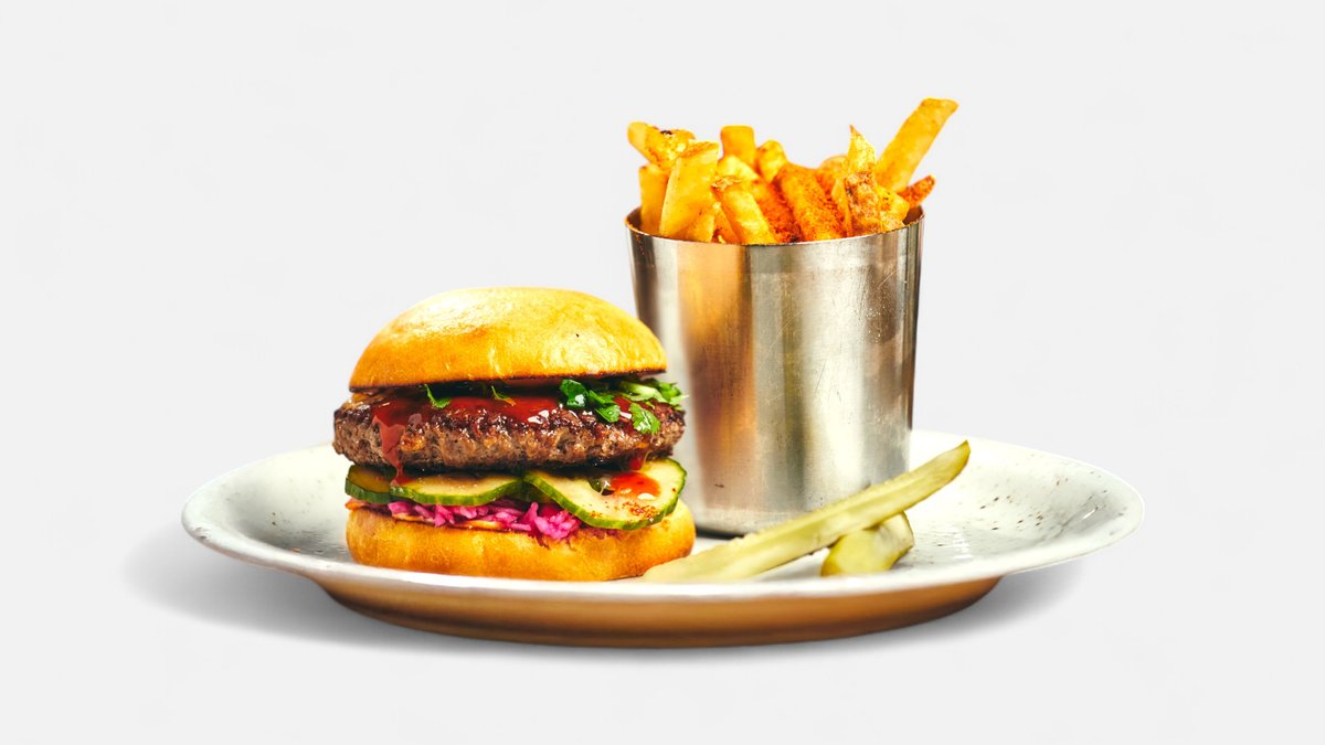 160g burger med Korean BBQ glaze, sesam- og chilisyltet agurk, jalapeño pickled slaw, koriander og chilimajones. Servers med et kick av sesam og chili på pommes fritsen.