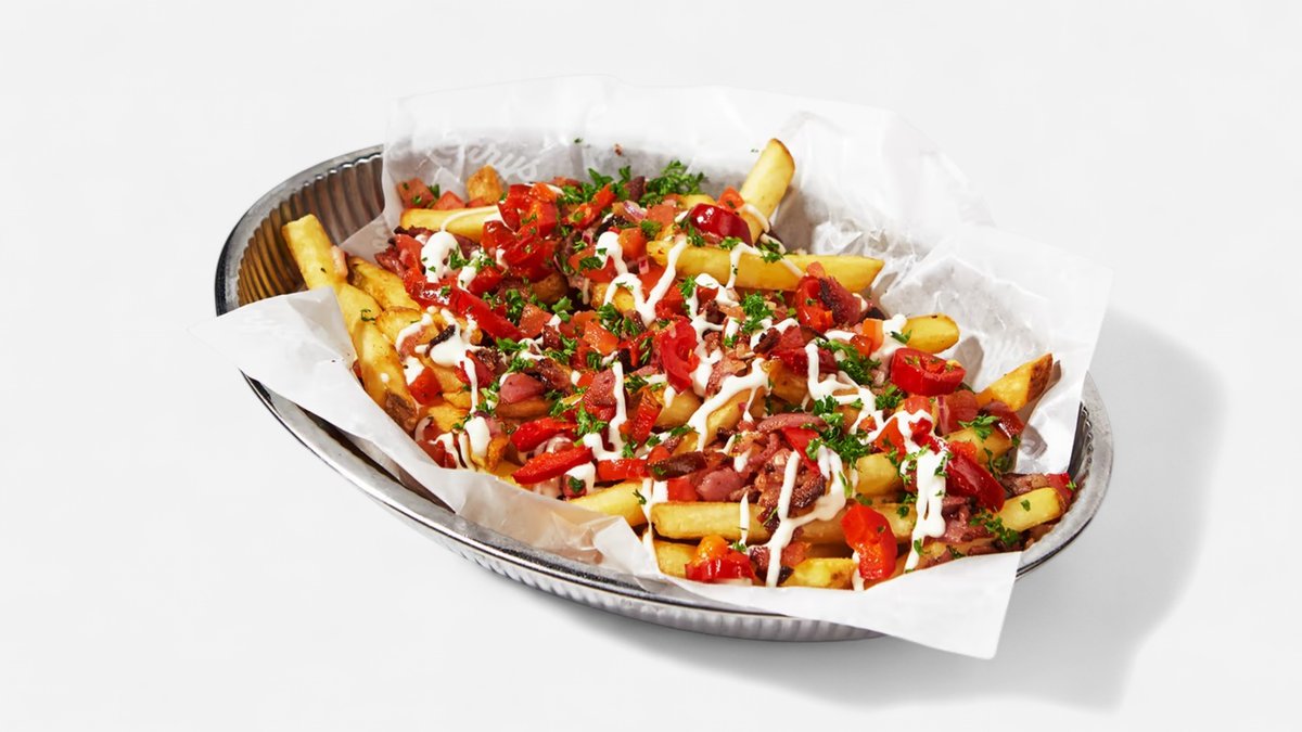 Pommes frites toppet med Bacon, Jalapeños, pico de gallo, finhakket gressløk og aioli.