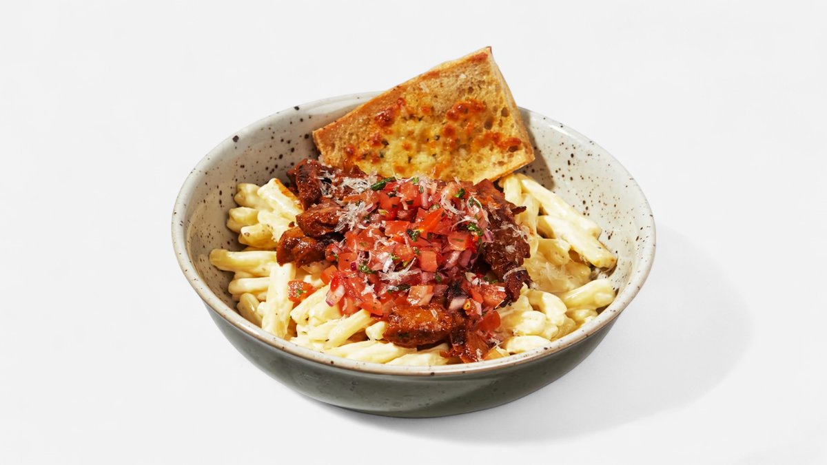 Kremet pasta med fløte, parmesanost, krydret vegan proteiner og pico de gallo. Serveres med gratinert hvitløksbrød.