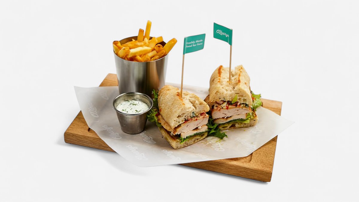 Grillet kyllingfilet i surdeigsbaguette med ranchdressing, guacamole, pico de Gallo, revet parmesan og sprø salat. Servers med ekstra ranch-dipp ved siden av.