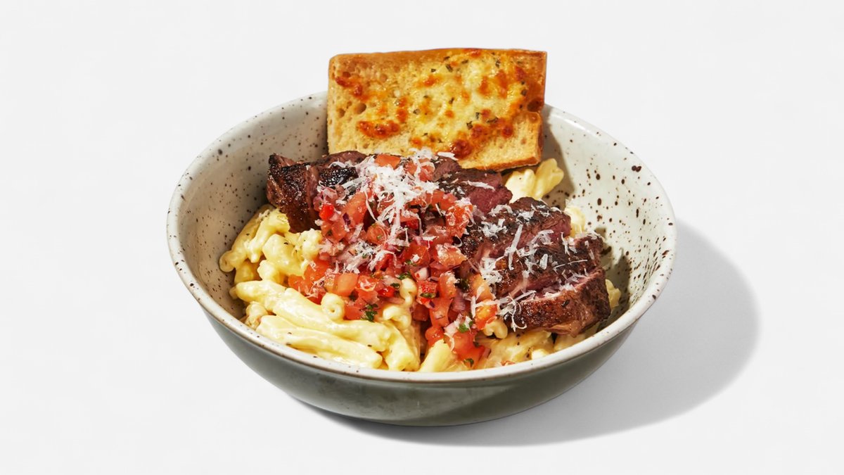 Kremet pasta med fløte, parmesanost, krydret biff og pico de gallo. Serveres med gratinert hvitløksbrød.