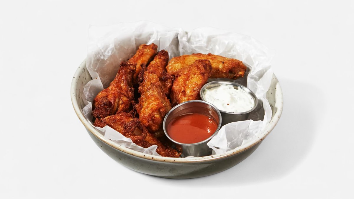Friterte kyllingvinger serveres med red hot sauce og ranch dressing ved siden av.