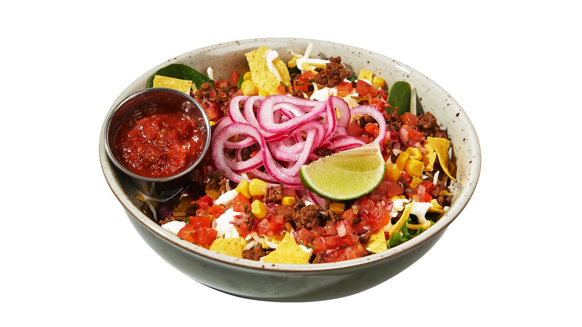 Tacokjøtt, blandingssalat, mais og nachos. Toppes med rømme, pico de gallo, syltet rødløk, lime, salsa, revet mozarella og cheddar.