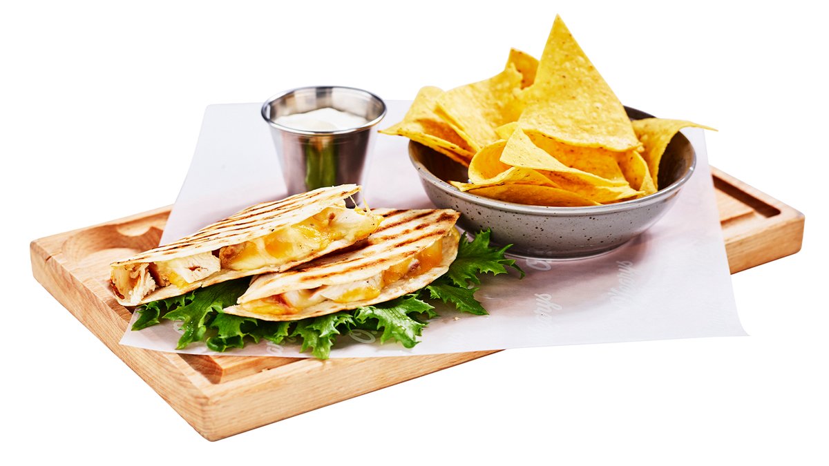 Tortilla med chipotle pulled chicken, pico de gallo og smeltet ost. Serveres med guacamole og rømme.