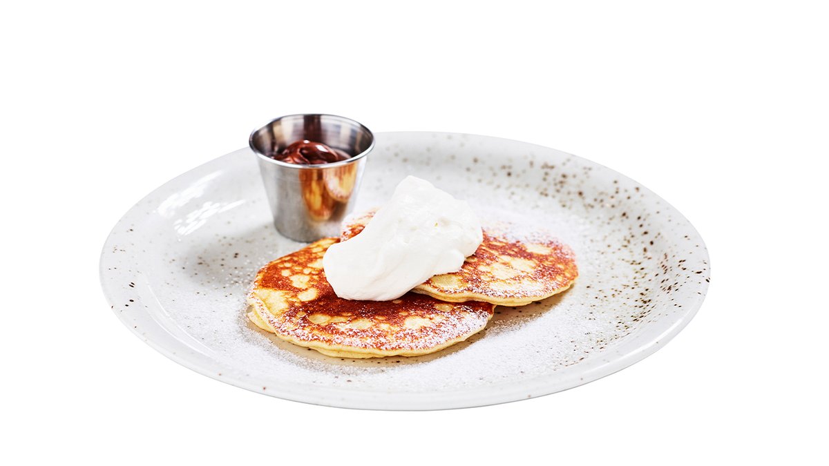 Amerikanske pannekaker servert med sjokoladesaus og pisket krem.