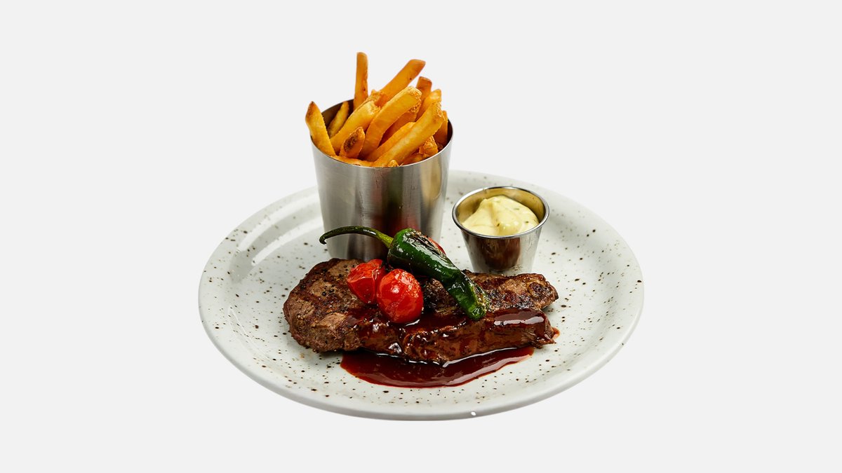 200g - Grillet ytrefilet servers med ovnsbakte cherry tomater, grillet pimentos de padron, pommes frites, bearnaisesaus og rødvinssaus.