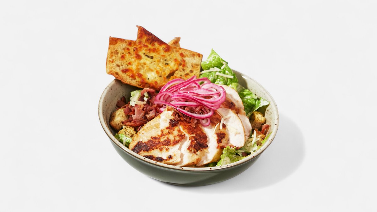 Cæsarsalat med grillet eller fritert kylling patty, bacon, krutonger, romanosalat og parmesan. Toppes med syltet rødløk og serveres med gratinert hvitløksbrød.