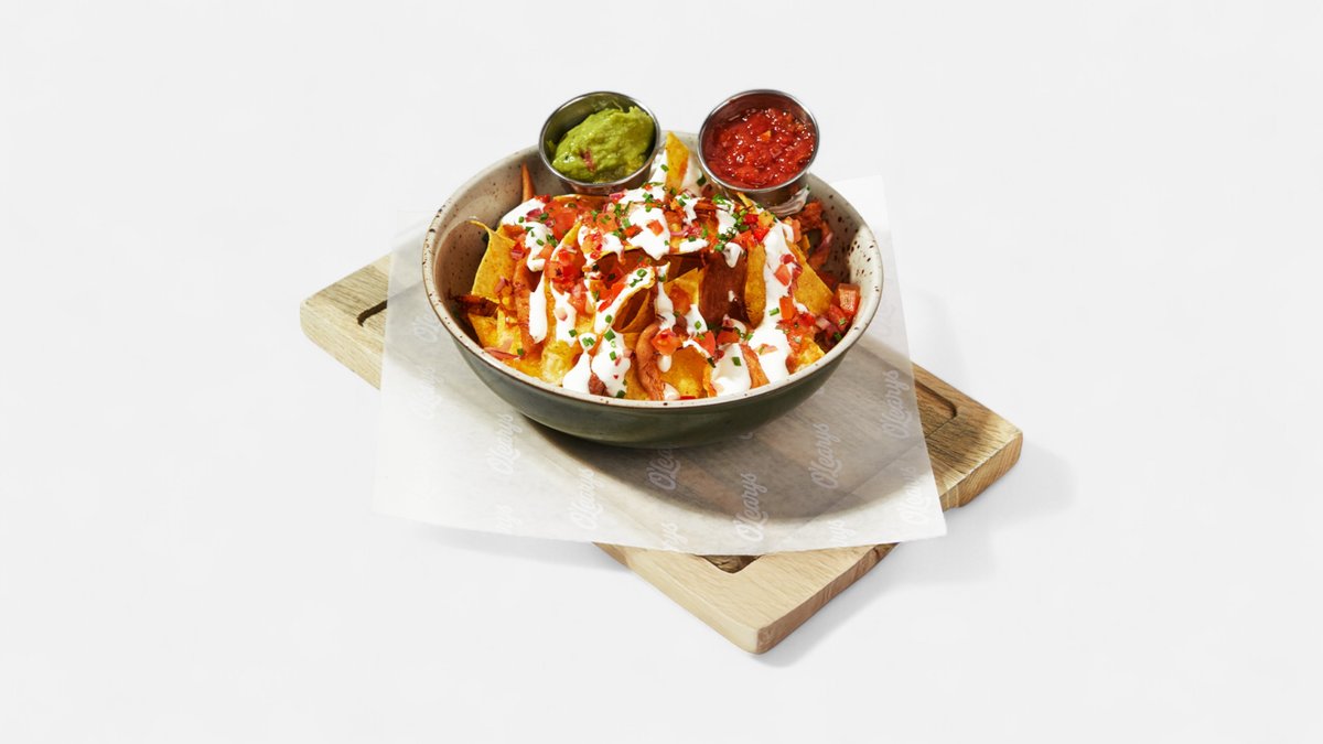 Sprø nachos toppet med pulled chicken, revet mozzarella og cheddar, rømme, guacamole, pico de gallo, gressløk og salsa. Kan fås vegetarisk.