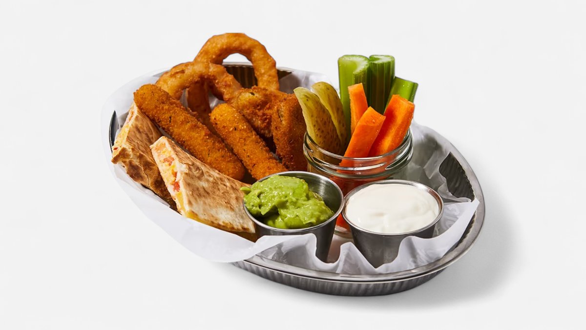 2 sprø cheese sticks, 2 friterte løkringer, 2 jalapeño poppers, gulrot, sylte agurk, selleri og 1/2 quesadilla. Serveres med rømme og guacamole.