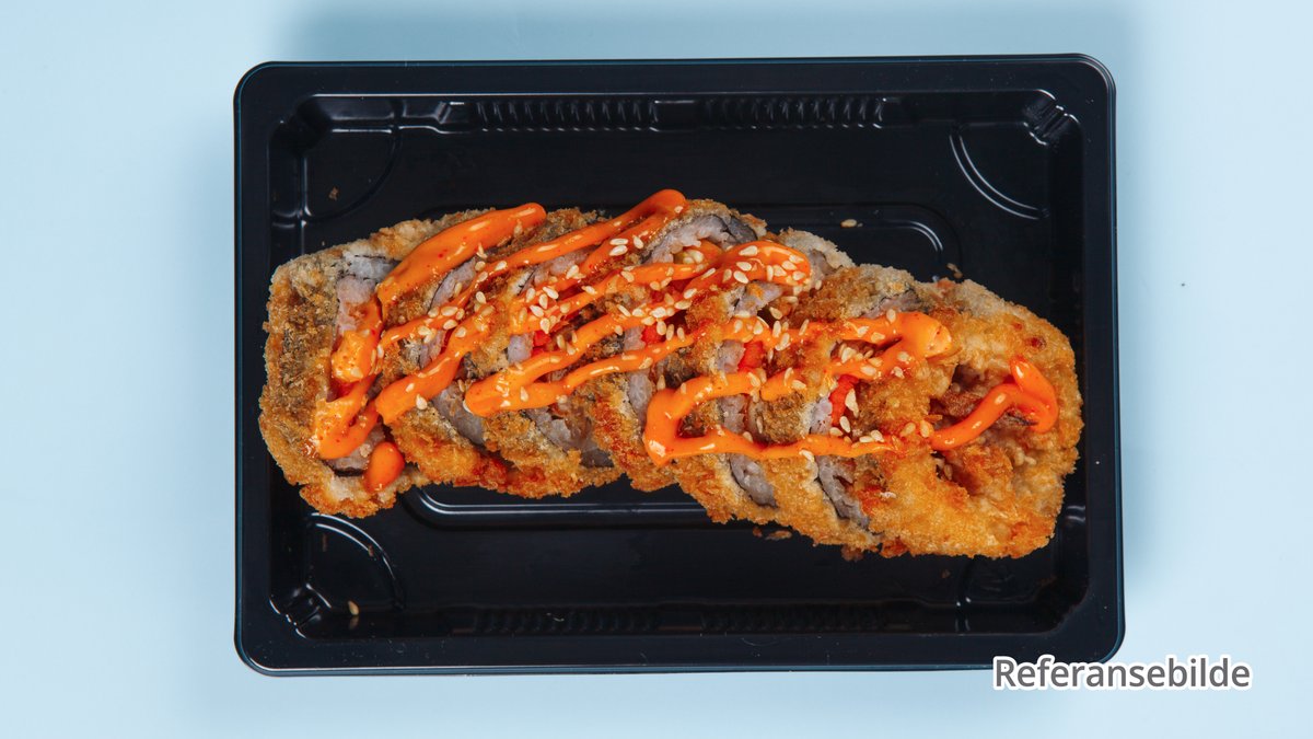 Fritert maki med fritert scampi, avokado, teriyakisaus og chilimayo.
