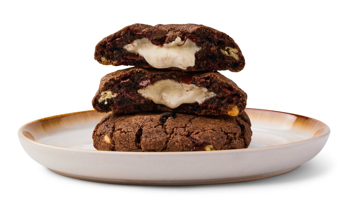 Cookie med hvit sjokolade, karamelisert hvit sjokolade og ekte bringebær.