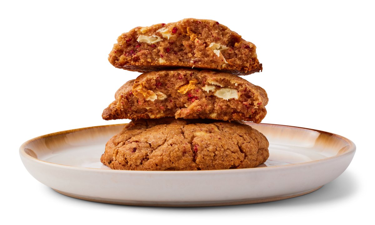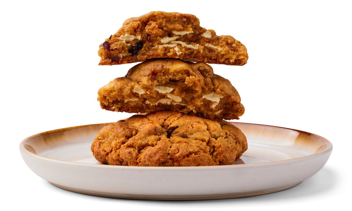 Cookie med hvit sjokolade, karamellisert hvit sjokolade, kandisert ingefær og tranebær.
