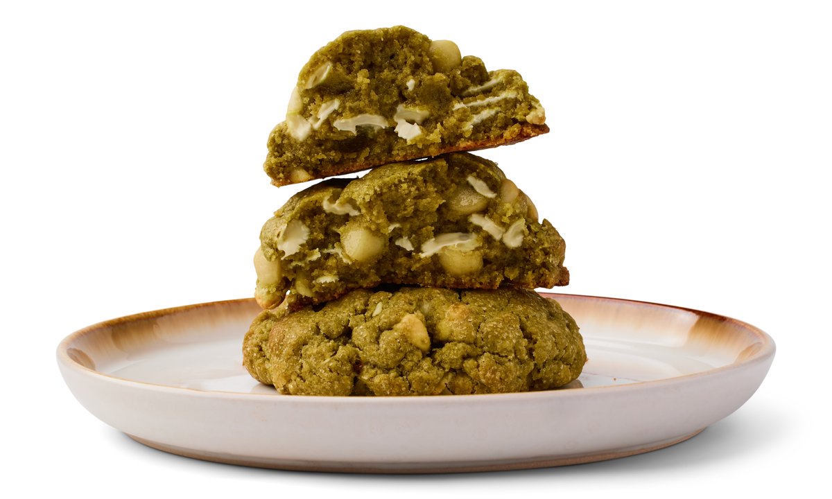 Cookie med hvit sjokolade, matcha og ristede macadamianøtter.