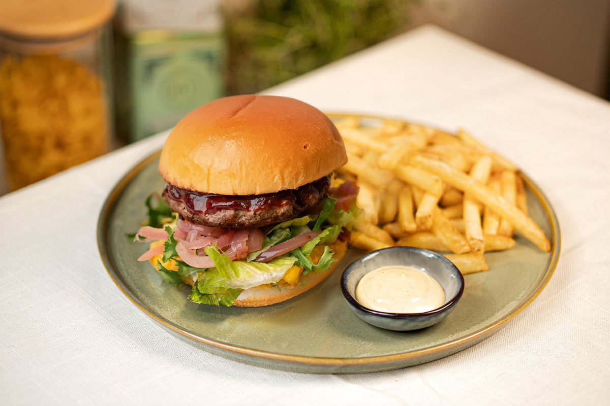 Storfeburger med maiskrem, syltet rødløk, BBQ saus, frisk salat, aioli. Serveres med vanlig fries, søtpotet fries eller saltbakte småpoteter