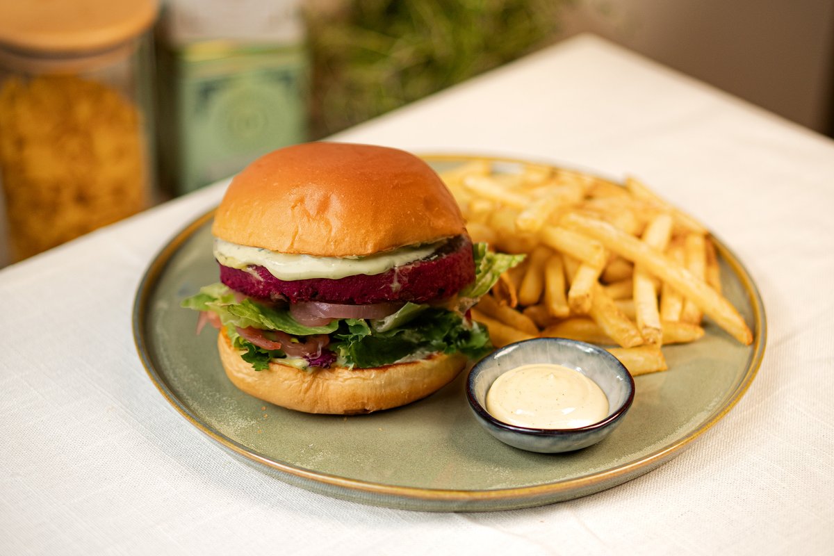 Rødbeteburger med syltet rødløk, frisk salat, urtedressing, aioli. Serveres med vanlig fries, søtpotet fries eller saltbakte småpoteter