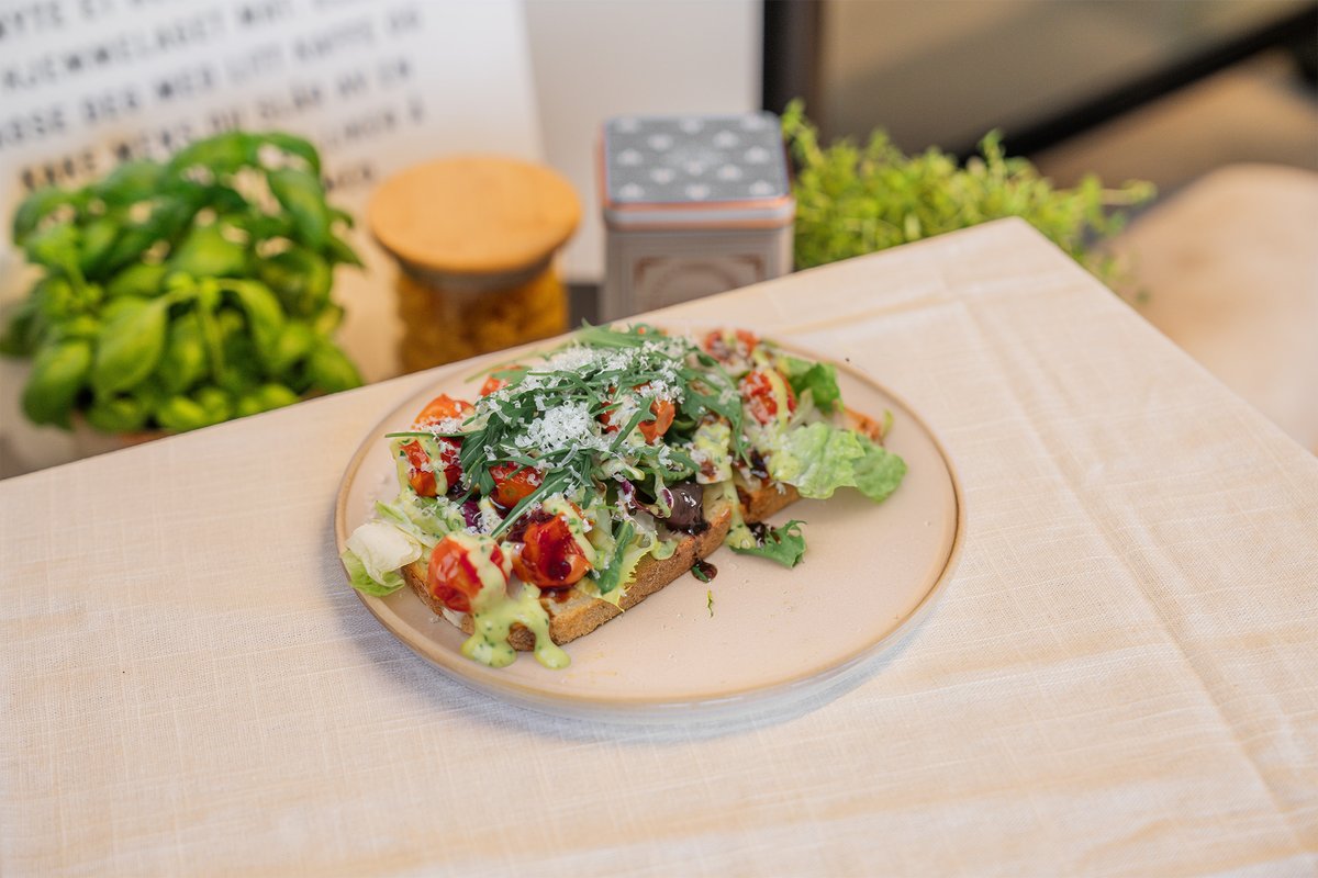 Surdeigsbrød, bakte tomater, ruccola, frisk salat, urtesmør, balsamico, parmesan