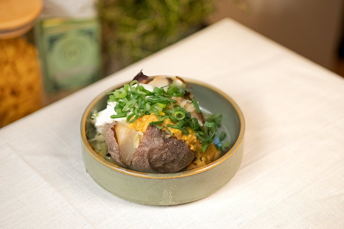 Chili sin carne, marinert biffkjøtt, ost, salsa, rømme, mais. Obs! kan oppleves litt sterk for noen barn