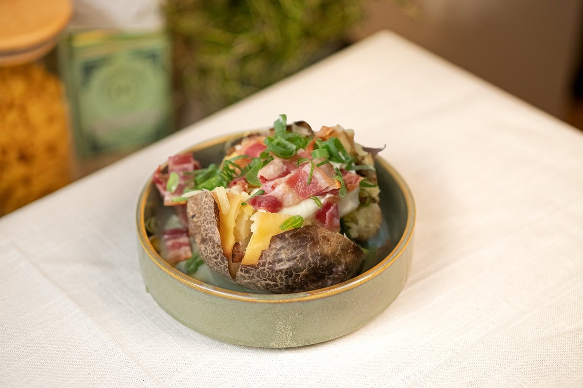 Skinke, bacon, potet, cherrytomat, syltet rødløk, frisk salat, gremolata, focaccia, smør.
